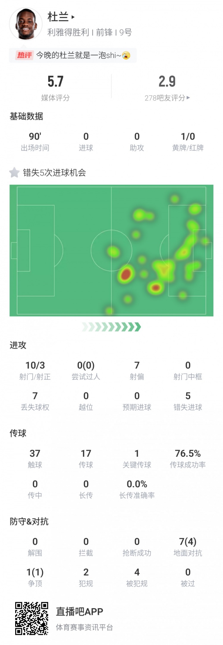 赛后数据统计,杜兰5次错失进球机会,怒砍5.7评分↓